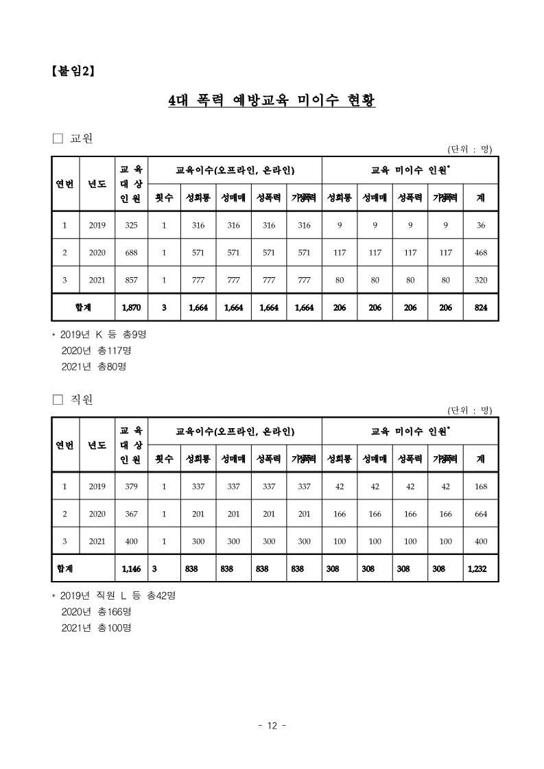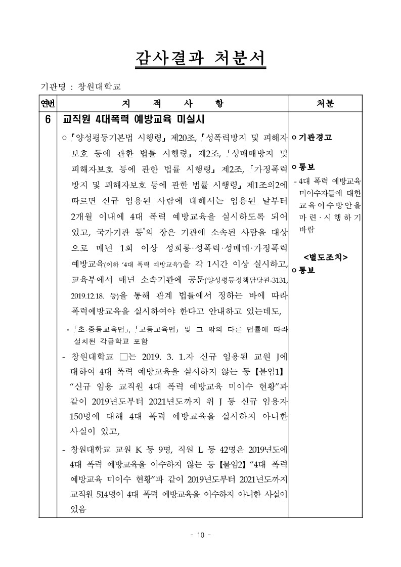 - 창원대학교 교원 K 등 9명, 직원 L 등 42명은 2019년도에 4대 폭력 예방교육을 이수하지 않는 등【붙임2】“4대 폭력 예방교육 미이수 현황”과 같이 2019년도부터 2021년도까지 교직원514명이4대폭력예방교육을이수하지아니한사실이 있음