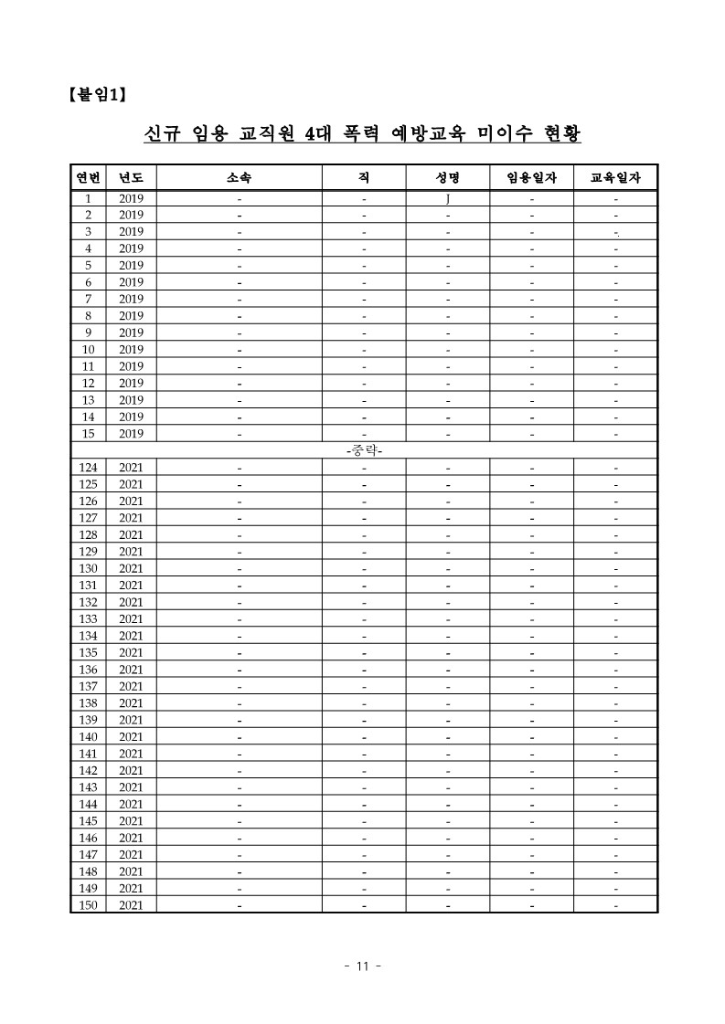 - 창원대학교 □는 2019. 3. 1.자 신규 임용된 교원 J에 대하여 4대 폭력 예방교육을 실시하지 않는 등【붙임1】 “신규 임용 교직원 4대 폭력 예방교육 미이수 현황”과 같이 2019년도부터 2021년도까지 위 J 등 신규 임용자 150명에 대해 4대 폭력 예방교육을 실시하지 아니한 사실이 있고,
