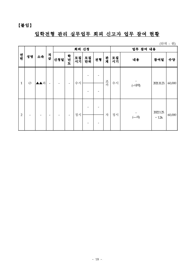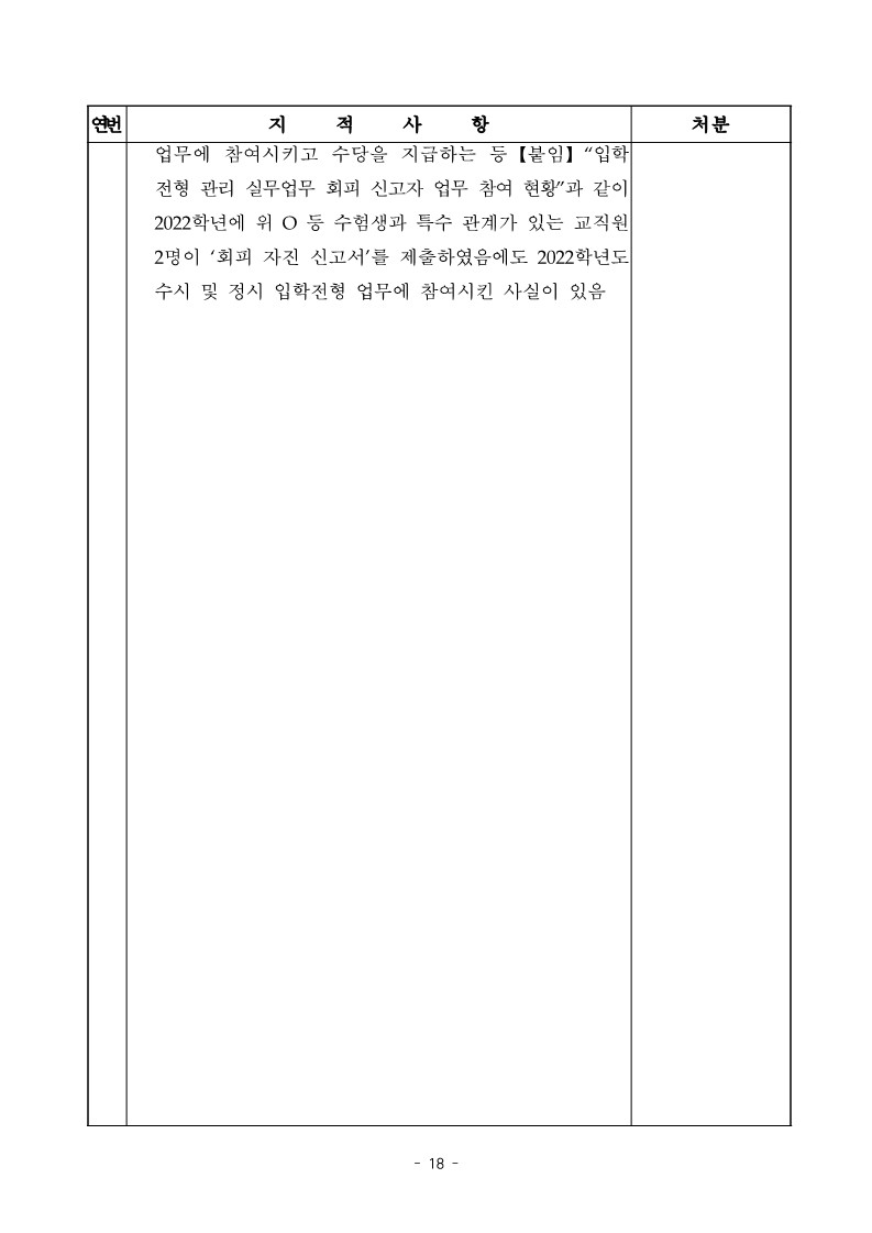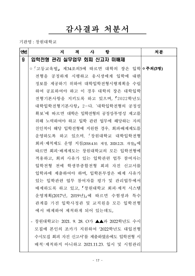 - 창원대학교는 2021. 9. 28. O가 ▲▲과 2022학년도 수시 모집에 본인의 조카가 지원하여 ‘2022학년도 대입전형 수시모집 회피 자진 신고서’를 제출하였음에도 입학전형 시 배척・제척하지 아니하고 2021.11.23. 입시 및 시험관리 업무에 참여시키고 수당을 지급하는 등【붙임】“입학전형 관리 실무업무 회피신고자 업무 참여 현황”과 같이 2022학년에 위 O 등 수험생과 특수관계가 있는 교직원 2명이 ‘회피 자진 신고서’를 제출하였음에도 2022학년도 수시 및 정시 입학전형 업무에 참여시킨 사실이 있음