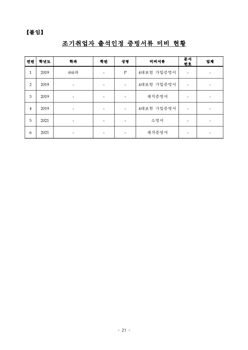 - 창원대학교는 @@과 P(학번 -)가 조기취업에 따른 출석인정(2019.3.4.~2019.6.21.) 처리를 하면서 필수 제출서류인 4대보험 가입증명서, 소명서 등 취업 확인 증명서류를 제출하지 않았는데도 출석인정 처리를 하는 등 【붙임】 “조기 취업자 출석인정 증빙서류 미비 현황”과 같이 2019.3월 부터 2021년 12월까지 위 P 등 6명이 조기취업자 출석인정 처리에 필요한 취업 확인 증명서류를 제출 하지 않았는데도 출석으로 인정한 사실이 있음