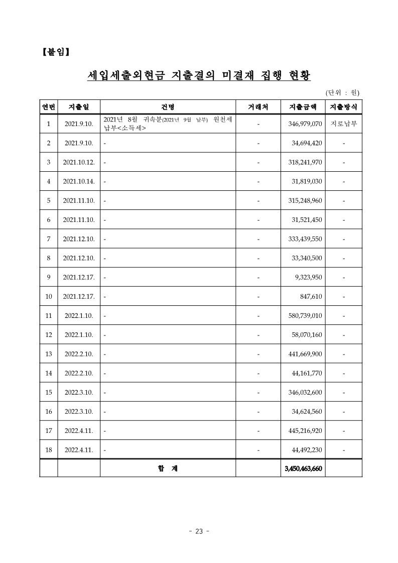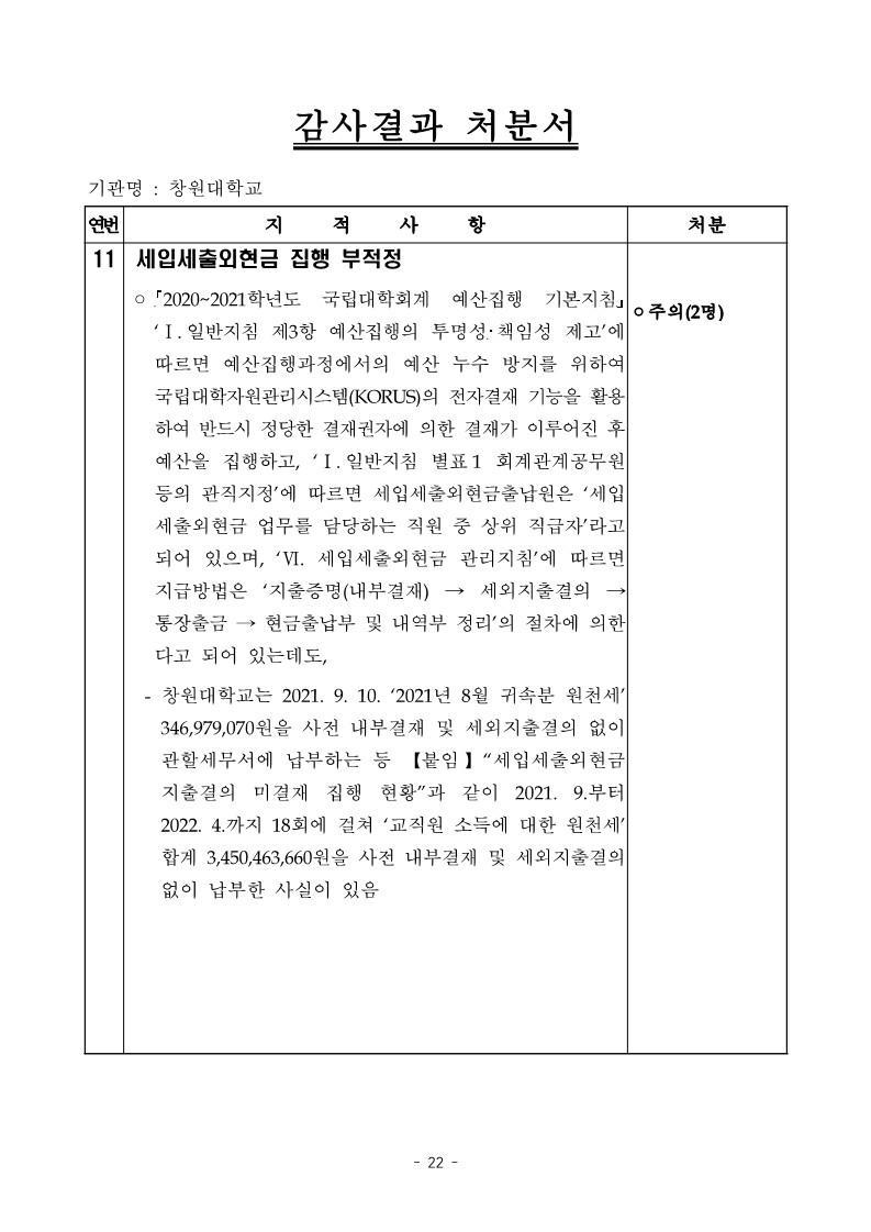 - 창원대학교는 2021. 9. 10. ‘2021년 8월 귀속분 원천세 346,979,070원을 사전 내부결재 및 세외지출결의 없이 관할세무서에 납부하는 등 【붙임 】“세입세출외현금 지출결의 미결재 집행 현황”과 같이 2021. 9.부터 2022. 4.까지 18회에 걸쳐 ‘교직원 소득에 대한 원천세 합계 3,450,463,660원을 사전 내부결재 및 세외지출결의 없이 납부한 사실이 있음