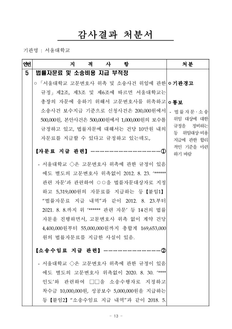 - 서울대학교 ◇은 고문변호사 위촉에 관한 규정이 있음에도 별도의 고문변호사 위촉없이 2012. 8. 23. ‘****** 관련 자문’과 관련하여 ○○을 법률자문대상자로 지정 하고 5,319,000원의 자문료를 지급하는 등【붙임1】 “법률자문료 지급 내역”과 같이 2012. 8. 23.부터 2021. 8. 8.까지 위 ‘****** 관련 자문’ 등 14건의 법률 자문을 진행하면서, 고문변호사 위촉 없이 계약 건당 4,400,000원부터 55,000,000원까지 총합계 169,653,000 원의 법률자문료를 지급한 사실이 있음.