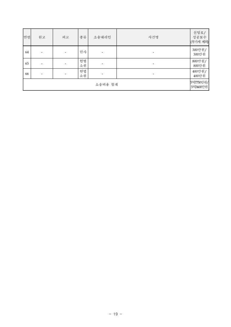 - 서울대학교 ◇은 고문변호사 위촉에 관한 규정이 있음에도 별도의 고문변호사 위촉없이 2020. 8. 30. ‘**** 인도’와 관련하여 □□을 소송수행자로 지정하고 착수금 10,000,000원, 성공보수 5,000,000원을 지급하는 등【붙임2】“소송수임료 지급 내역”과 같이 2018. 5.부터 2021. 8.까지 위 ‘******인도’ 등 66건의 소송계약을 체결하면서, 고문변호사 위촉 없이 계약 건당 1,500,000원부터 50,000,000원까지 총합계 1,103,500,000 원의 소송비용(착수금 성공보수 포함) 계약을 체결한 사실이 있음.