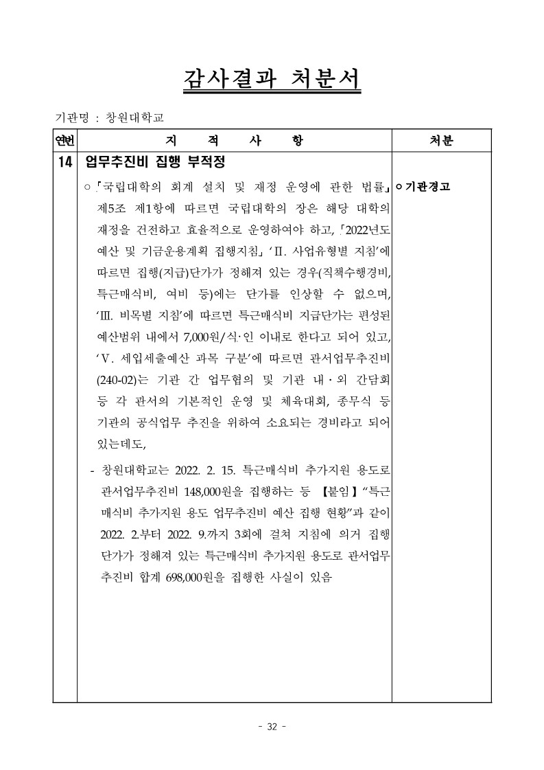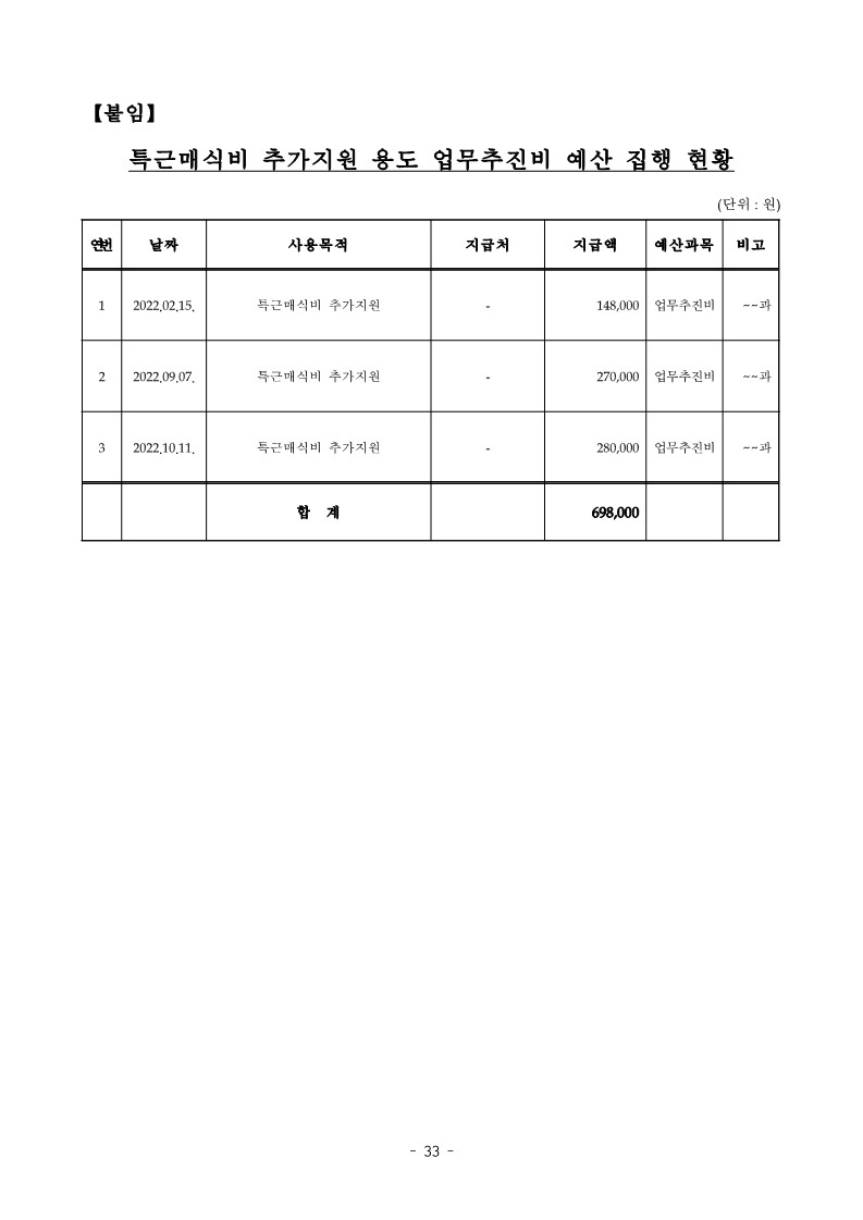 - 창원대학교는 2022. 2. 15. 특근매식비 추가지원 용도로 관서업무추진비 148,000원을 집행하는 등 【붙임】“특근 매식비 추가지원 용도 업무추진비 예산 집행 현황”과 같이 2022. 2.부터 2022. 9.까지 3회에 걸쳐 지침에 의거 집행 단가가 정해져 있는 특근매식비 추가지원 용도로 관서업무 추진비 합계 698,000원을 집행한 사실이 있음