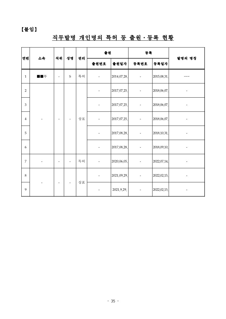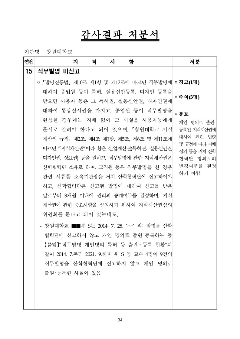 - 창원대학교 ■■부 S는 2014. 7. 28. ‘~~’ 직무발명을 산학 협력단에 신고하지 않고 개인 명의로 출원・등록하는 등 【붙임】“직무발명 개인명의 특허 등 출원ㆍ등록 현황”과 같이 2014. 7.부터 2021. 9.까지 위 S 등 교수 4명이 9건의 직무발명을 산학협력단에 신고하지 않고 개인 명의로 출원・등록한 사실이 있음