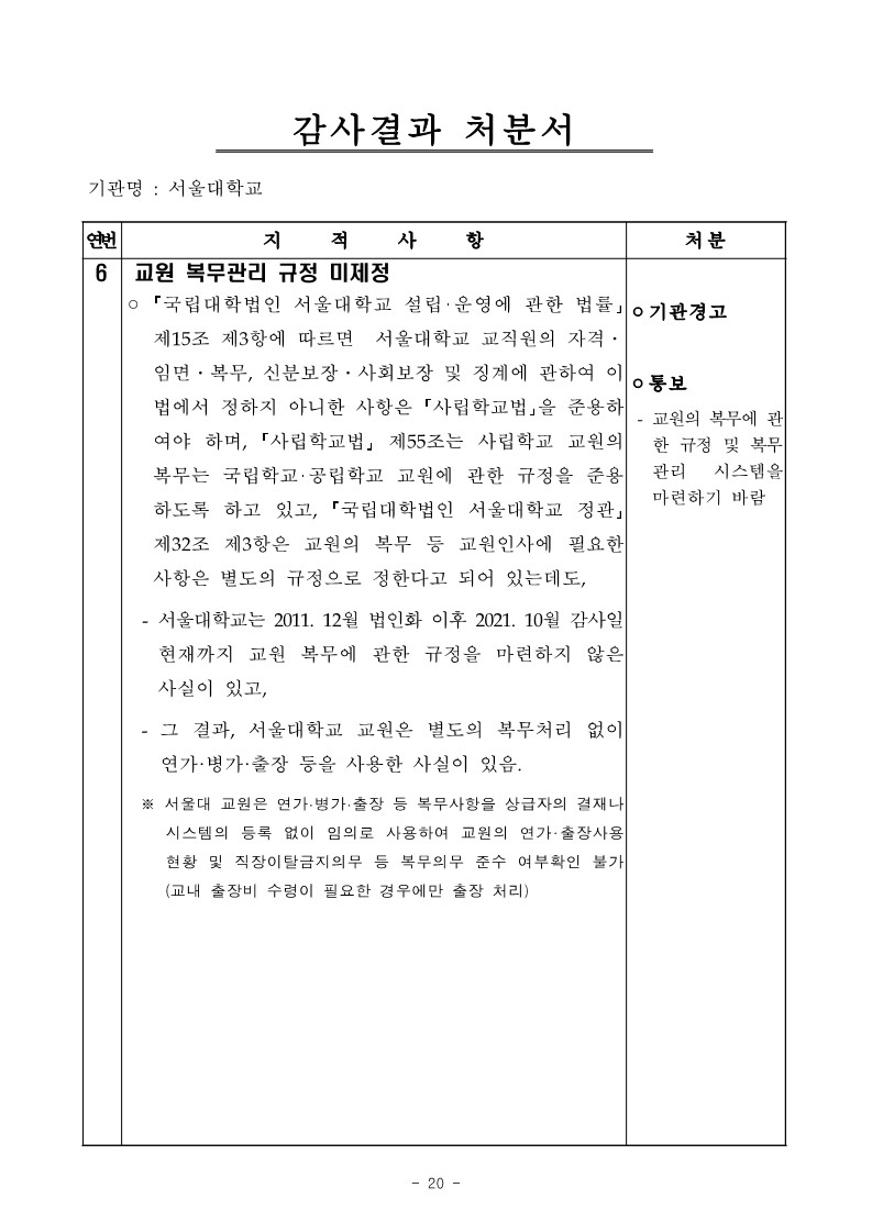 - 서울대학교는 2011. 12월 법인화 이후 2021. 10월 감사일 현재까지 교원 복무에 관한 규정을 마련하지 않은 사실이 있고,