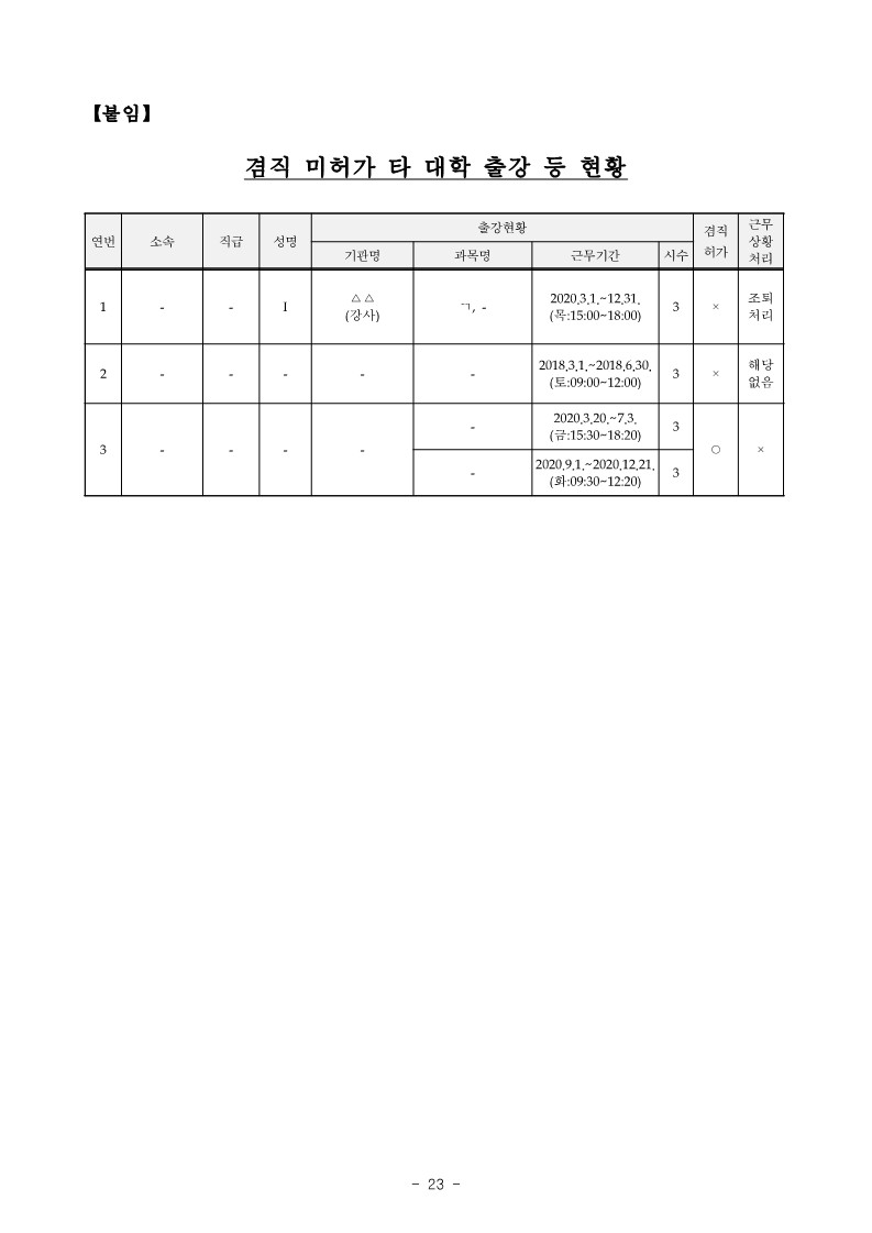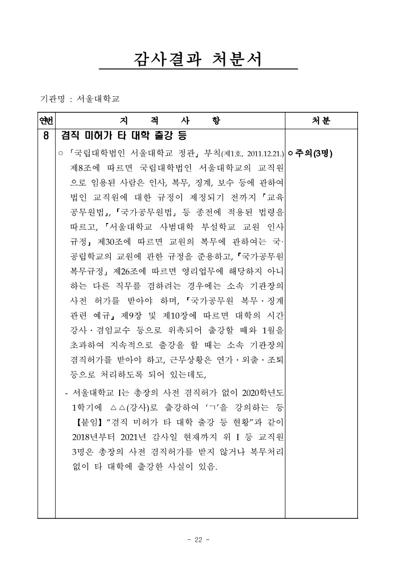 - 서울대학교 I는 총장의 사전 겸직허가 없이 2020학년도 1학기에 △△(강사)로 출강하여 ‘ㄱ’을 강의하는 등 【붙임】“겸직 미허가 타 대학 출강 등 현황”과 같이 2018년부터 2021년 감사일 현재까지 위 I 등 교직원 3명은 총장의 사전 겸직허가를 받지 않거나 복무처리 없이 타 대학에 출강한 사실이 있음.