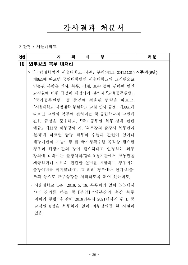 - 서울대학교 L은 2018. 5. 18. 복무처리 없이 ▷▷에서 ‘ㄴ’ 강의를 하는 등【붙임】“외부강의 출강 복무 미처리 현황”과 같이 2018년부터 2021년까지 위 L 등 교직원 8명은 복무처리 없이 외부강의를 한 사실이 있음.