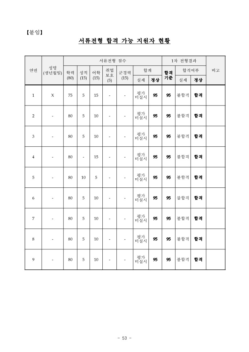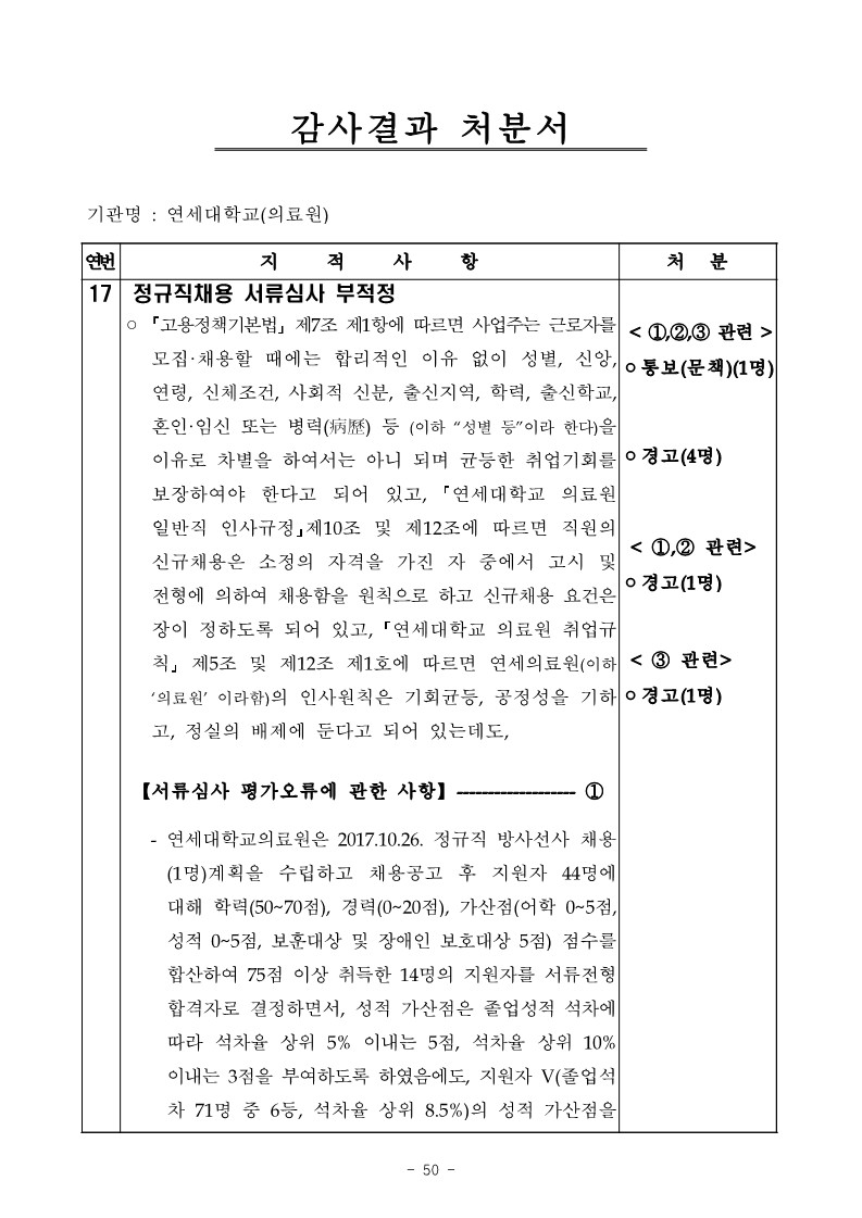 - 한편, ‘2018. 12. 3. 정규직(전환조건) 사무원 채용계획을 수립하고 채용공고 후, 지원자 599명에 대해 학력 (40~80점), 성적(0~15점), 가산점(어학 0~15점, 취업 보호 대상자 및 보훈대상자 5점, 군 경력자 15점) 점수를 합산하여 95점 이상 취득할 경우 서류전형 합격자로 결정하면서, 서류전형 기준에 없던 “과거 1년 내 연세대학교 의료원 채용과정에서 탈락한 이력이 있는 지원자는 불합격 처리한다”는 기준을 임의로 만들어 적용함으로써【붙임】“서류전형 합격 가능 지원자 현황”과 같이 X 등 합격 가능 지원자 9명을 포함한 187명을 서류심사 없이 불합격 시킨 사실이 있음.