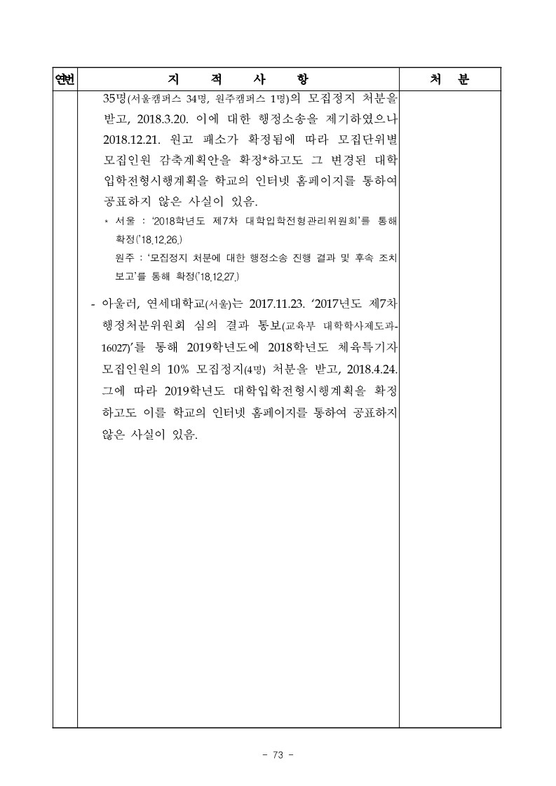 - 아울러, 연세대학교(서울)는 2017.11.23. ‘2017년도 제7차 행정처분위원회 심의 결과 통보(교육부 대학학사제도과 16027)’를 통해 2019학년도에 2018학년도 체육특기자 모집인원의 10% 모집정지(4명) 처분을 받고, 2018.4.24. 그에 따라 2019학년도 대학입학전형시행계획을 확정 하고도 이를 학교의 인터넷 홈페이지를 통하여 공표하지 않은 사실이 있음.