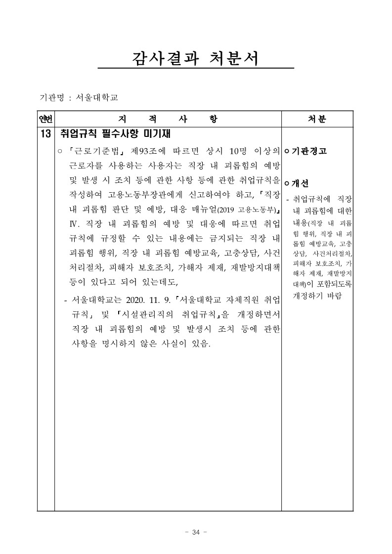 - 서울대학교는 2020. 11. 9. 서울대학교 자체직원 취업 규칙 및 시설관리직의 취업규칙 을 개정하면서 직장 내 괴롭힘의 예방 및 발생시 조치 등에 관한 사항을 명시하지 않은 사실이 있음.