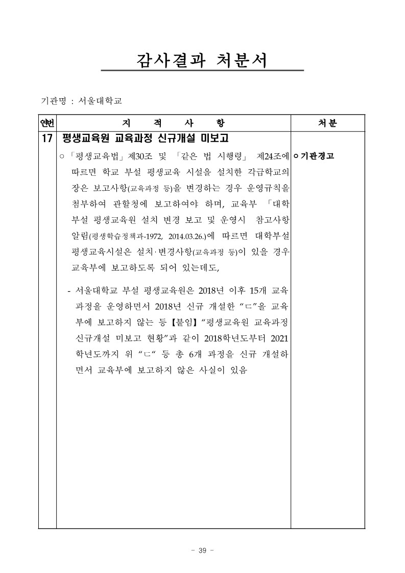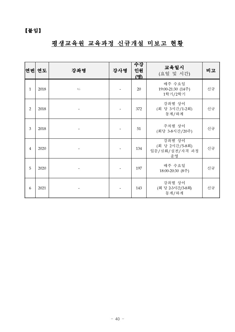 - 서울대학교 부설 평생교육원은 2018년 이후 15개 교육 과정을 운영하면서 2018년 신규 개설한 “ㄷ”을 교육 부에 보고하지 않는 등【붙임】“평생교육원 교육과정 신규개설 미보고 현황”과 같이 2018학년도부터 2021 학년도까지 위 “ㄷ“ 등 총 6개 과정을 신규 개설하면서 교육부에 보고하지 않은 사실이 있음