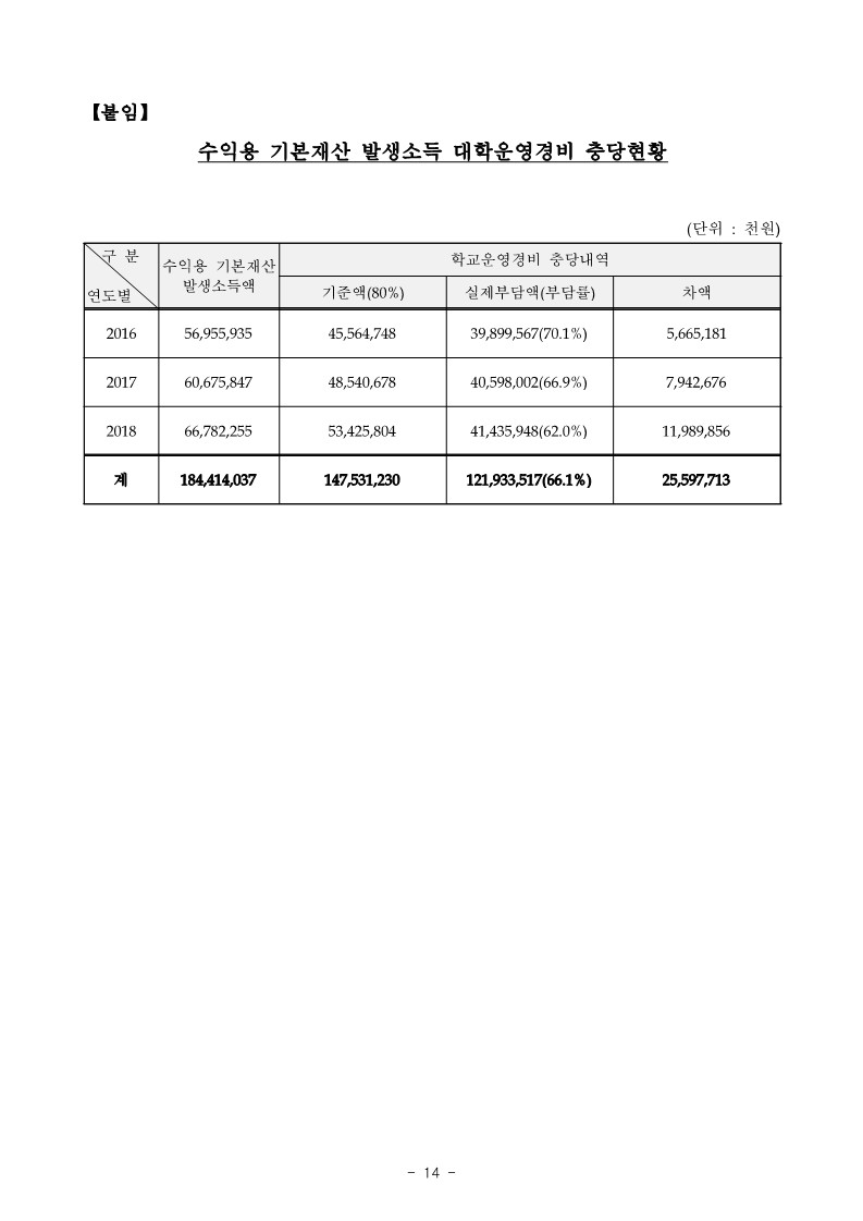 ◦ 사립학교법 제5조제1항에 따르면 학교법인은 그 설치 경영하는 사립학교에 필요한 시설·설비와 당해 학교의 경영에 필요한 재산을 갖추도록 되어 있고, 대학설립 운영 규정 제7조제1항 및 제8조에 따르면 학교법인은 연간 학교회계 운영수익 총액에 해당하는 가액(대학의 경우 300억원 이상)의 수익용 기본재산을 확보하여야 하며, 그가 설립·경영하는 대학에 대하여 매년 수익용 기본재산에서 생긴 소득의 100분의 80이상에 해당하는 가액을 대학운영에 필요한 경비로 충당하여야 한다고 되어 있는데도,- 학교법인 연세대학교는 2016년 수익용 기본재산에서 발생한 소득이 56,955,935천원임에도 70.1%(39,899,567천원)만 교비회계로 전출하는 등【붙임】“수익용 기본재산 발생 소득 대학운영경비 충당현황”과 같이 2016년부터 2018년까지 수익용 기본재산에서 발생한 소득의 62.0% 에서 70.1%까지만 대학운영 경비로 충당함으로써 3년간 합계 25,597,713천원을 부족하게 교비회계로 전출한 사실이 있음