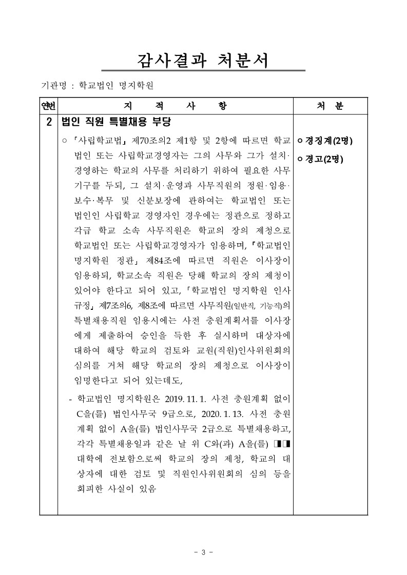 - 학교법인 명지학원은 2019. 11. 1. 사전 충원계획 없이 C을(를) 법인사무국 9급으로, 2020. 1. 13. 사전 충원 계획 없이 A을(를) 법인사무국 2급으로 특별채용하고 각각 특별채용일과 같은 날 위 C와(과) A을(를) ◨◨ 대학에 전보함으로써 학교의 장의 제청, 학교의 대 상자에 대한 검토 및 직원인사위원회의 심의 등을 회피한 사실이 있음
