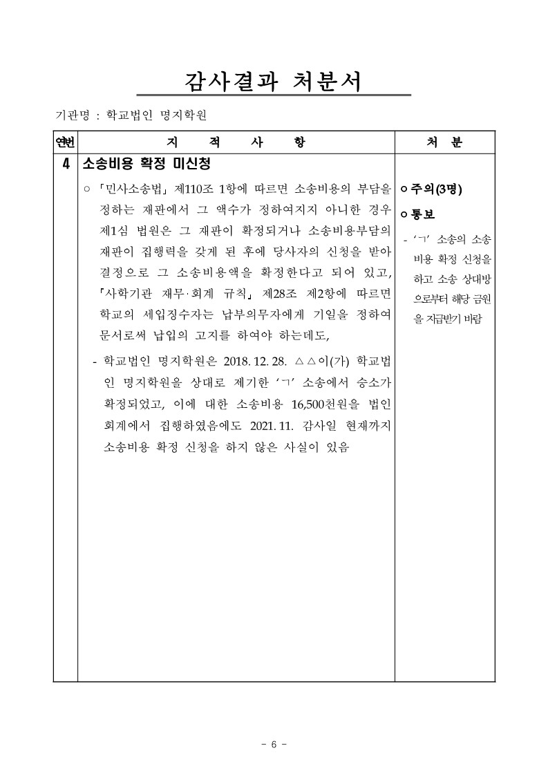 - 학교법인 명지학원은 2018. 12. 28. △△이(가) 학교법인 명지학원을 상대로 제기한 ‘ㄱ’ 소송에서 승소가 확정되었고, 이에 대한 소송비용 16,500천원을 법인 회계에서 집행하였음에도 2021. 11. 감사일 현재까지 소송비용 확정 신청을 하지 않은 사실이 있음