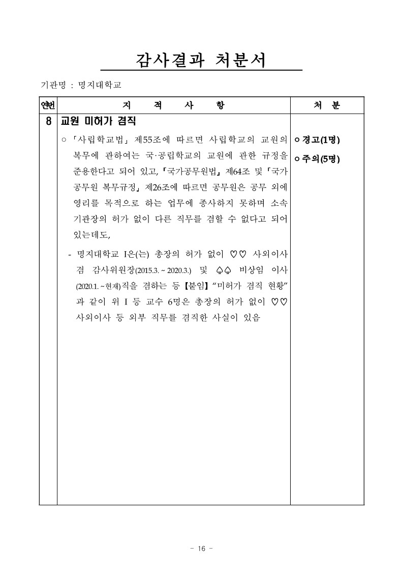 - 명지대학교 I은(는) 총장의 허가 없이 ♡♡ 사외이사 겸 감사위원장(2015.3. ~ 2020.3.) 및 ♤♤ 비상임 이사 (2020.1. ~현재)직을 겸하는 등【붙임】“미허가 겸직 현황” 과 같이 위 I 등 교수 6명은 총장의 허가 없이 ♡♡ 사외이사 등 외부 직무를 겸직한 사실이 있음