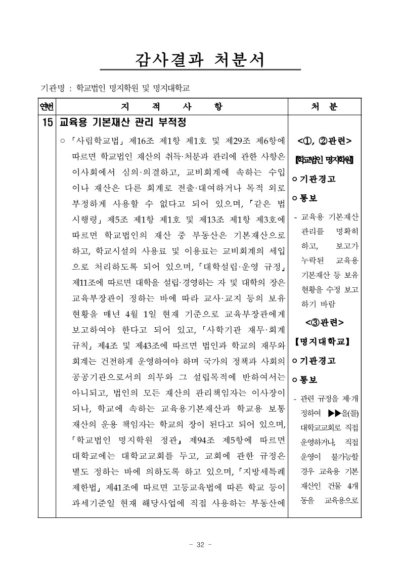- 학교법인 명지학원은 1987. 10. 6. 이사회의 심의·의결을 거치지 아니한 채 서울특별시 ㅂ 소재 토지(32㎡)를 취득(1997. 4. 29. 사후 심의)하는 등【붙임】“▶▶ 관련 교육용 기본재산 현황” ‘비고’란 기재와 같이 1987. 부터 2011.까지 총 6차례에 걸쳐 이사회 심의·의결을 거치지 아니한 채 위 ㅂ 소재 토지(32㎡) 등 9개의 교육용 재산을 취득(미심의 3개, 사후 심의 6개)한 사실 이 있음