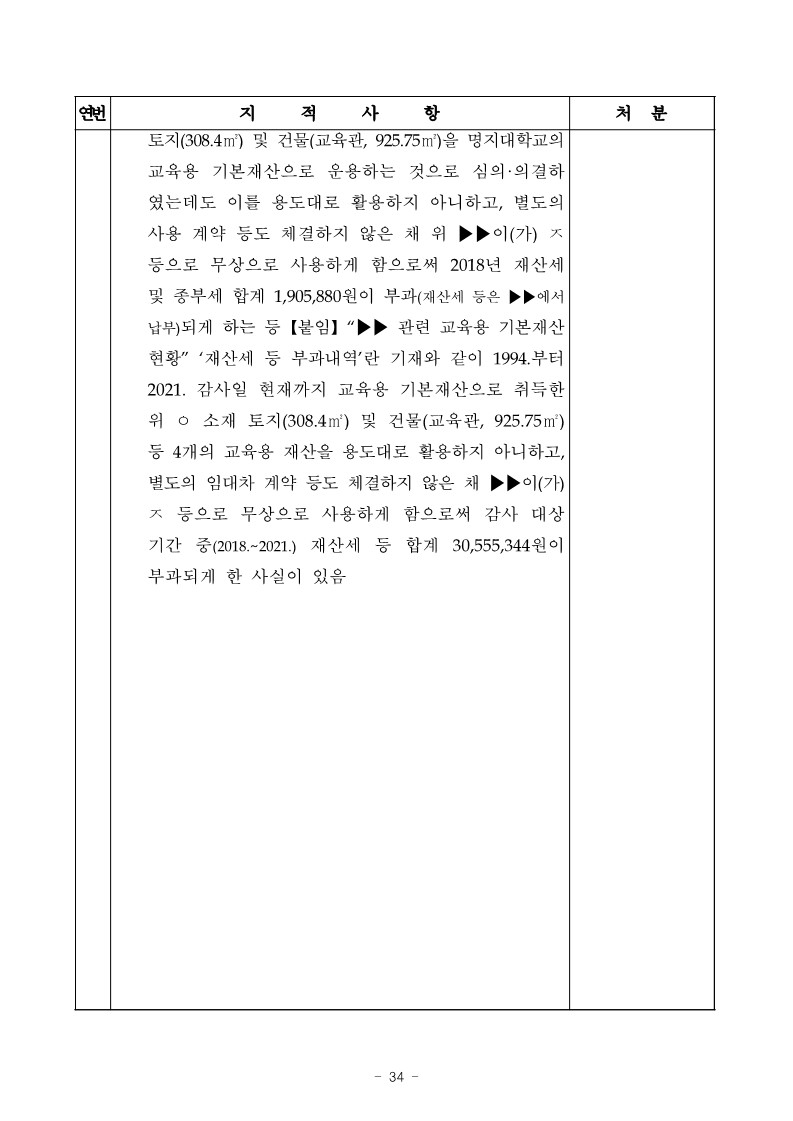 - 명지대학교는 1999. 8. 27. 개최된 이사회에서 ▶▶에서 기부받아 취득한(1999. 7. 19. ) 서울특별시 ㅇ 소재 토지(308.4㎡) 및 건물(교육관, 925.75㎡)을 명지대학교의 교육용 기본재산으로 운용하는 것으로 심의·의결하 였는데도 이를 용도대로 활용하지 아니하고, 별도의 사용 계약 등도 체결하지 않은 채 위 ▶▶이(가) ㅈ 등으로 무상으로 사용하게 함으로써 2018년 재산세 및 종부세 합계 1,905,880원이 부과(재산세 등은 ▶▶에서 납부)되게 하는 등【붙임】“▶▶ 관련 교육용 기본재산 현황” ‘재산세 등 부과내역’란 기재와 같이 1994.부터 2021. 감사일 현재까지 교육용 기본재산으로 취득한 위 ㅇ 소재 토지(308.4㎡) 및 건물(교육관, 925.75㎡ 등 4개의 교육용 재산을 용도대로 활용하지 아니하고 별도의 임대차 계약 등도 체결하지 않은 채 ▶▶이(가 ㅈ 등으로 무상으로 사용하게 함으로써 감사 대상 기간 중(2018.~2021.) 재산세 등 합계 30,555,344원이 부과되게 한 사실이 있음