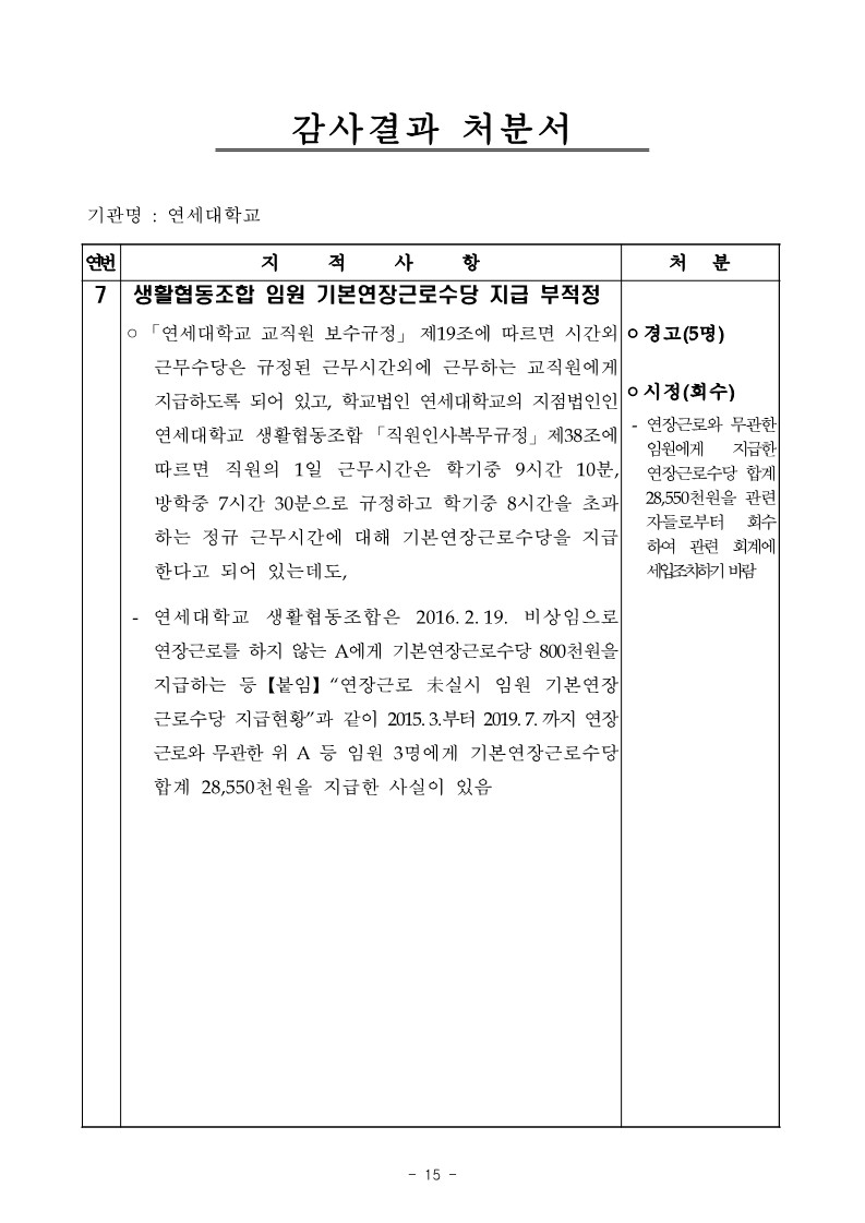 ◦「연세대학교 교직원 보수규정」제19조에 따르면 시간외근무수당은 규정된 근무시간외에 근무하는 교직원에게 지급하도록 되어 있고, 학교법인 연세대학교의 지점법인인 연세대학교 생활협동조합「직원인사복무규정」제38조에 따르면 직원 1일 근무시간은 학기중 9시간 10분 방학중 7시간 30분으로 규정하고 학기중 8시간을 초과 하는 정규 근무시간에 대해 기본연장근로수당을 지급 한다고 되어 있는데도,