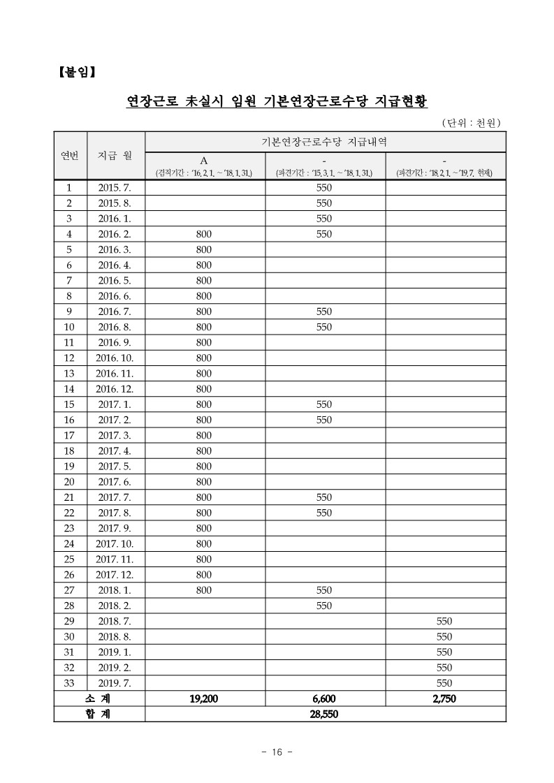 - 연세대학교 생활협동조합은 2016. 2. 19. 비상임으로 연장근로를 하지 않는 A에게 기본연장근로수당 800천원을 지급하는 등【붙임】“연장근로 未실시 임원 기본연장 근로수당 지급현황”과 같이 2015. 3.부터 2019. 7. 까지 연장 근로와 무관 위 A 등 임원 3명에게 기본연장근로수당 합계 28,550천원을 지급한 사실이 있음