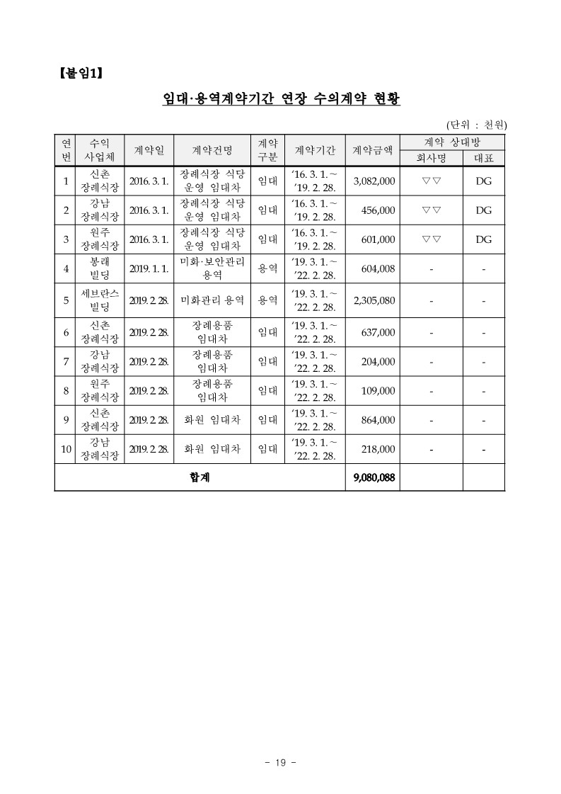 - 이에근거하여,위학교법인의수익사업체인신촌장례식장은 2012. 3. 1. ▽▽(대표자 DG)과 “신촌장례식장 식당 운영 임대 계약(계약기간 ‘12. 3. 1. ∼’16. 2. 28.) 체결 후, 해당 계약기간 만료 전 일반경쟁에 부쳐 계약을 진행하지 않고 2016. 3. 1. 같은 업체와 계약기간을 3년 연장하는 수의계약(계약금액 3,082,000천원, 계약기간 2017. 3. 1.∼2018. 2. 28.)을 체결하는 등 【붙임1】“임대·용역계약기간 연장 수의계약 현황”과 같이 2016. 3.부터 2019. 2.까지 위 신촌장례식장 등 5개 수익사업체는 위 식당 운영 임대계약 등 총 10건(계약 금액 합계 9,080,088천원)의 임대·용역계약을 기존 업체와 계약기간을 연장하여 수의계약으로 체결한 사실이 있음