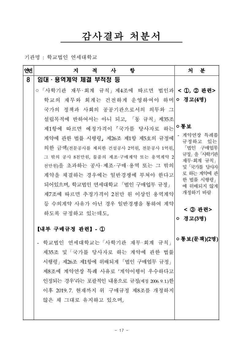 - 학교법인 연세대학교는「사학기관 재무 회계 규칙」 제35조 및「국가를 당사자로 하는 계약에 관한 법률 시행령」제26조 제1항에 위배되게「법인 구매업무 규정」 제8조에 계약연장 특례 사유로 ‘계약이행이 우수하다고 인정되는 경우’라는 포괄적인 내용으로 규정(제정 2006. 9. 1.)한 이후 2019. 7. 현재까지 위 구매규정 제8조를 개정하지 않은 채 그대로 유지하고 있으며,
