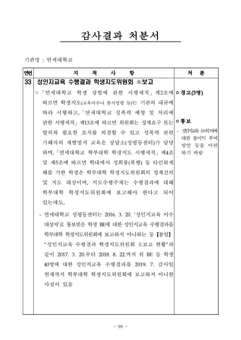 - 연세대학교 성평등센터는 2016. 3. 20. ‘성인지교육 이수 대상자’로통보받은학생BE에대한성인지교육수행결과를 학부대학 학생지도위원회에 보고하지 아니하는 등【붙임】 “성인지교육 수행결과 학생지도위원회 未보고 현황”과 같이 2017. 3. 20.부터 2018. 8. 22.까지 위 BE 등 학생 40명에 대한 성인지교육 수행결과를 2019. 7. 감사일 현재까지 학부대학 학생지도위원회에 보고하지 아니한 사실이 있음