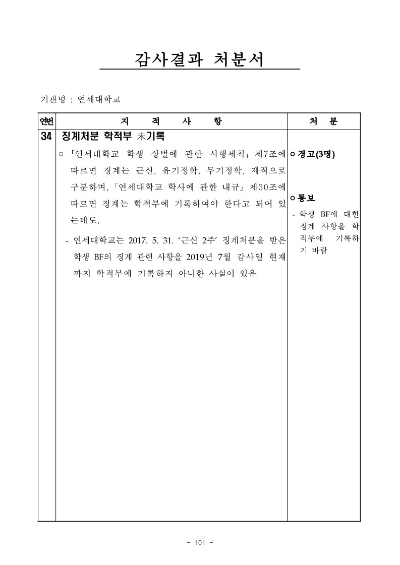 - 연세대학교는 2017. 5. 31. ‘근신 2주’ 징계처분을 받은 학생 BF의 징계 관련 사항을 2019년 7월 감사일 현재 까지 학적부에 기록하지 아니한 사실이 있음