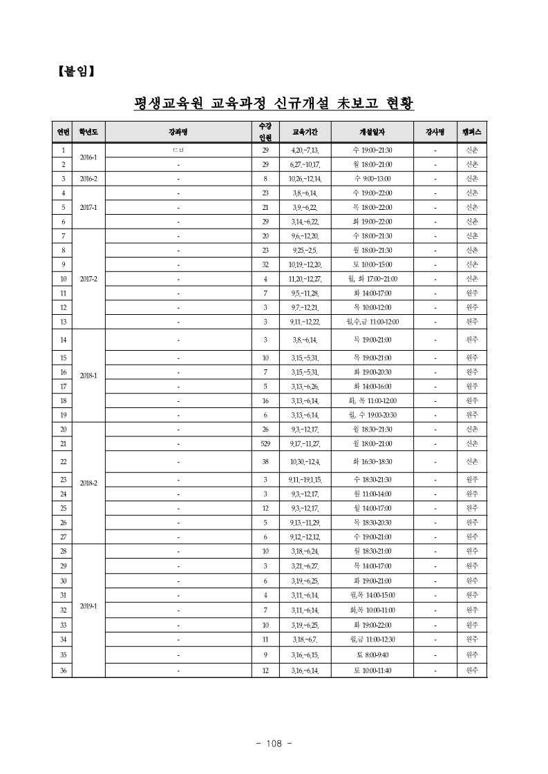 - 연세대학교 부설 평생교육원은 2016학년도 1학기 ‘ㄷㅂ (강사 BH)’을 신규 개설하면서 교육부에 보고하지 않는 등【붙임】“평생교육원 교육과정 신규개설 未보고 현황”과 같이 2016학년도 1학기부터 2019학년도 1학기까지 위 ‘ㄷㅂ’ 등 총 36개 과정을 신규개설하면서 교육부에 보고하지 않은 사실이 있음.