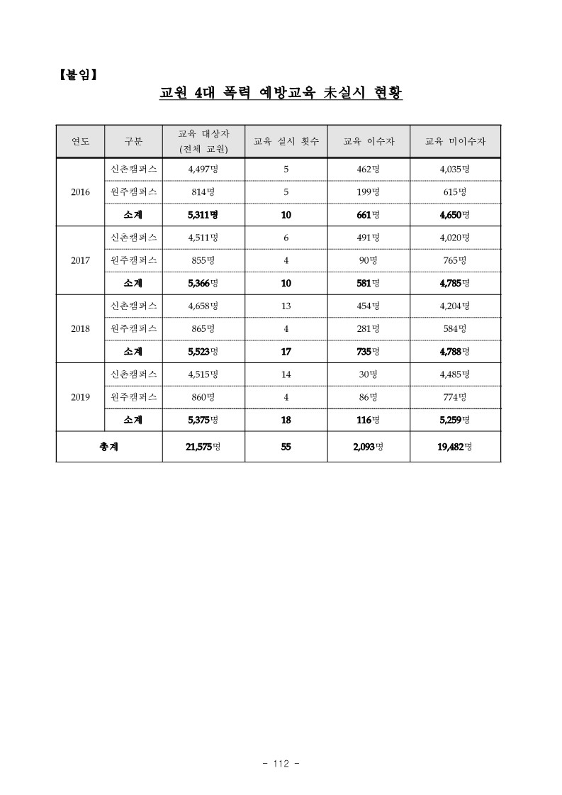- 연세대학교는 2016년도 교원 5,311명 중 4,650명에 대해 4대 폭력 예방교육을 실시하지 않는 등【붙임】‘교원 4대 폭력 예방교육 未실시 현황”과 같이 2016년도부터 2019년도 7월 감사일 현재까지 교원 19,482명(중복 포함)에 대하여 4대 폭력 예방교육을 실시하지 않은 사실이 있음