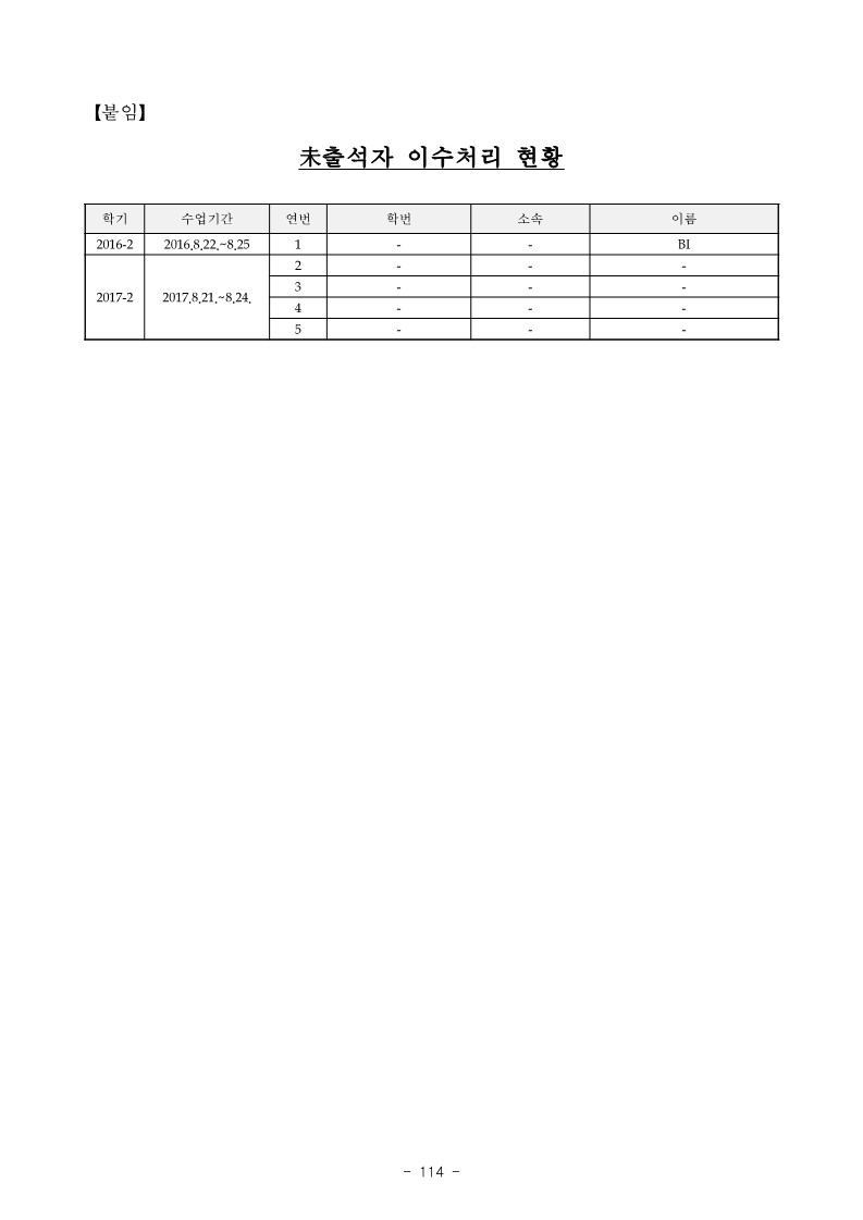 - ㄸ과목에 출석하 지 않았는데도 이수처리된 BI 등5명에대하여 학칙에따라성적 취소등조치를 취하기 바람