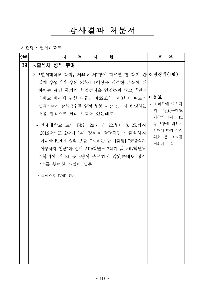 - 연세대학교 교수 BB는 2016. 8. 22.부터 8. 25.까지 2016학년도 2학기 ‘ㄸ*’ 강의를 담당하면서 출석하지 아니한 BI에게 성적 ‘P’를 부여하는 등 【붙임】“未출석자 이수처리 현황”과 같이 2016학년도 2학기 및 2017학년도 2학기에 위 BI 등 5명이 출석하지 않았는데도 성적 ‘P’를 부여한 사실이 있음.