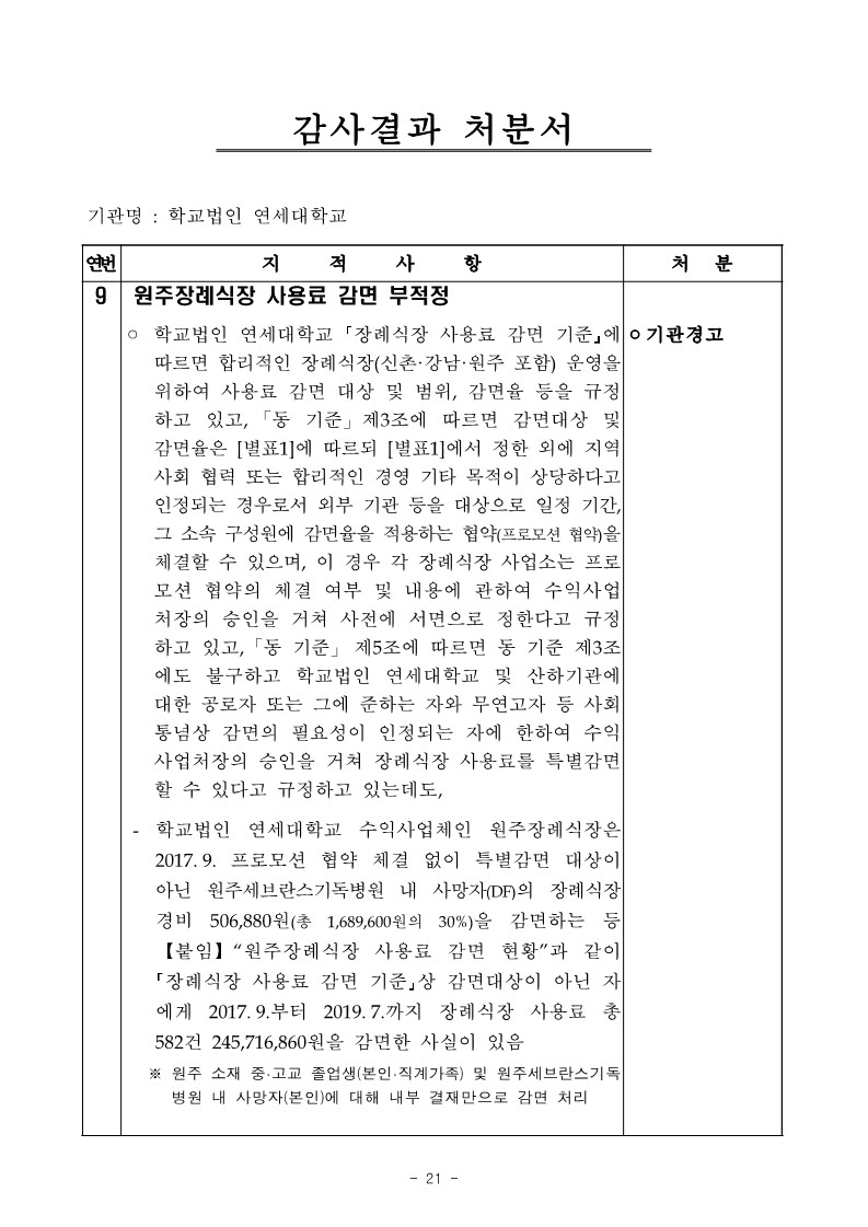- 학교법인 연세대학교 수익사업체인 원주장례식장은 2017. 9. 프로모션 협약 체결 없이 특별감면 대상이 아닌 원주세브란스기독병원 내 사망자(DF)의 장례식장 경비 506,880원(총 1,689,600원의 30%)을 감면하는 등 【붙임】“원주장례식장 사용료 감면 현황”과 같이 장례식장 사용료 감면 기준 상 감면대상이 아닌 자 에게 2017. 9.부터 2019. 7.까지 장례식장 사용료 총 582건 245,716,860원을 감면한 사실이 있음