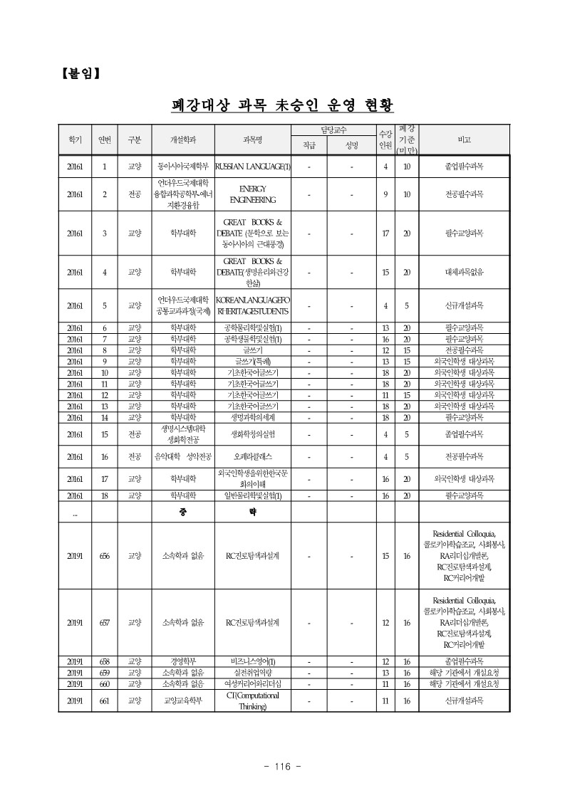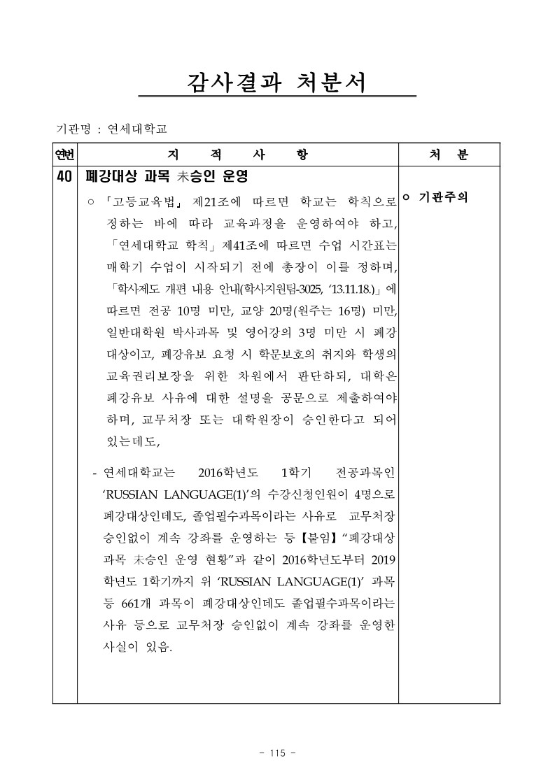 - 연세대학교는 2016학년도 1학기 전공과목인 ‘RUSSIAN LANGUAGE(1)’의 수강신청인원이 4명으로 폐강대상인데도, 졸업필수과목이라는 사유로 교무처장 승인없이 계속 강좌를 운영하는 등【붙임】“폐강대상 과목 未승인 운영 현황”과 같이 2016학년도부터 2019 학년도 1학기까지 위 ‘RUSSIAN LANGUAGE(1)’ 과목 등 661개 과목이 폐강대상인데도 졸업필수과목이라는 사유 등으로 교무처장 승인없이 계속 강좌를 운영한 사실이 있음.