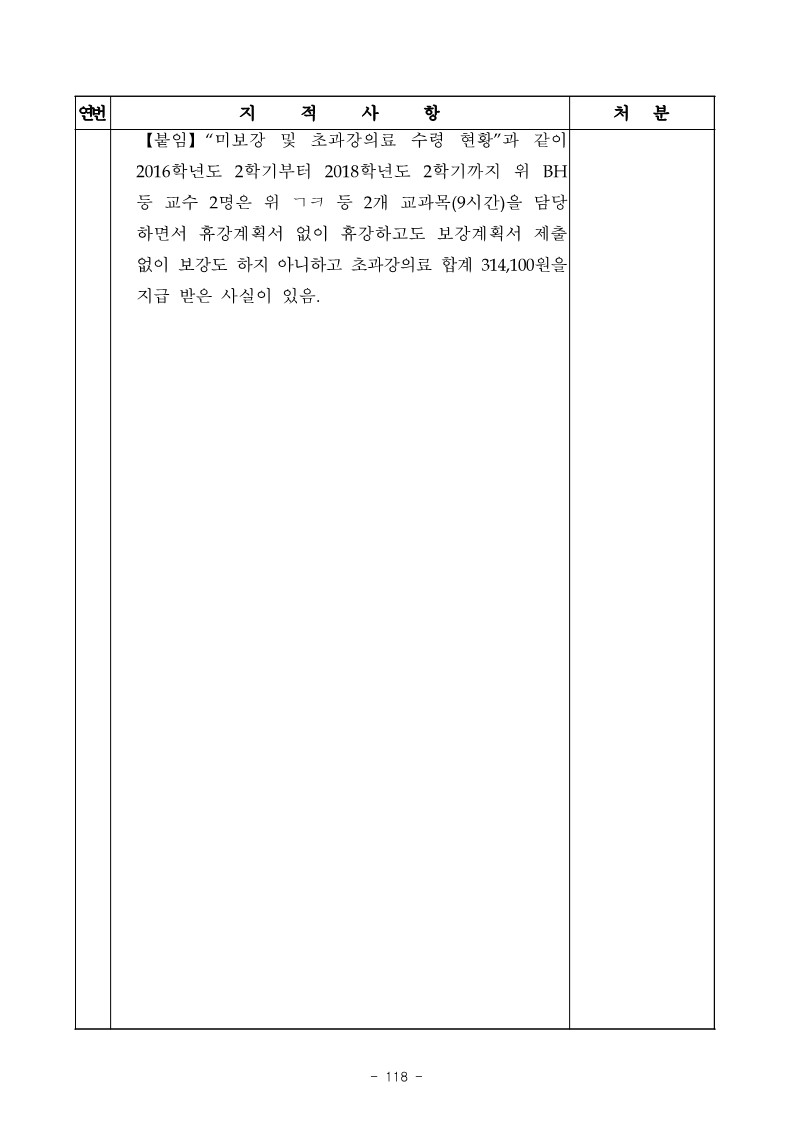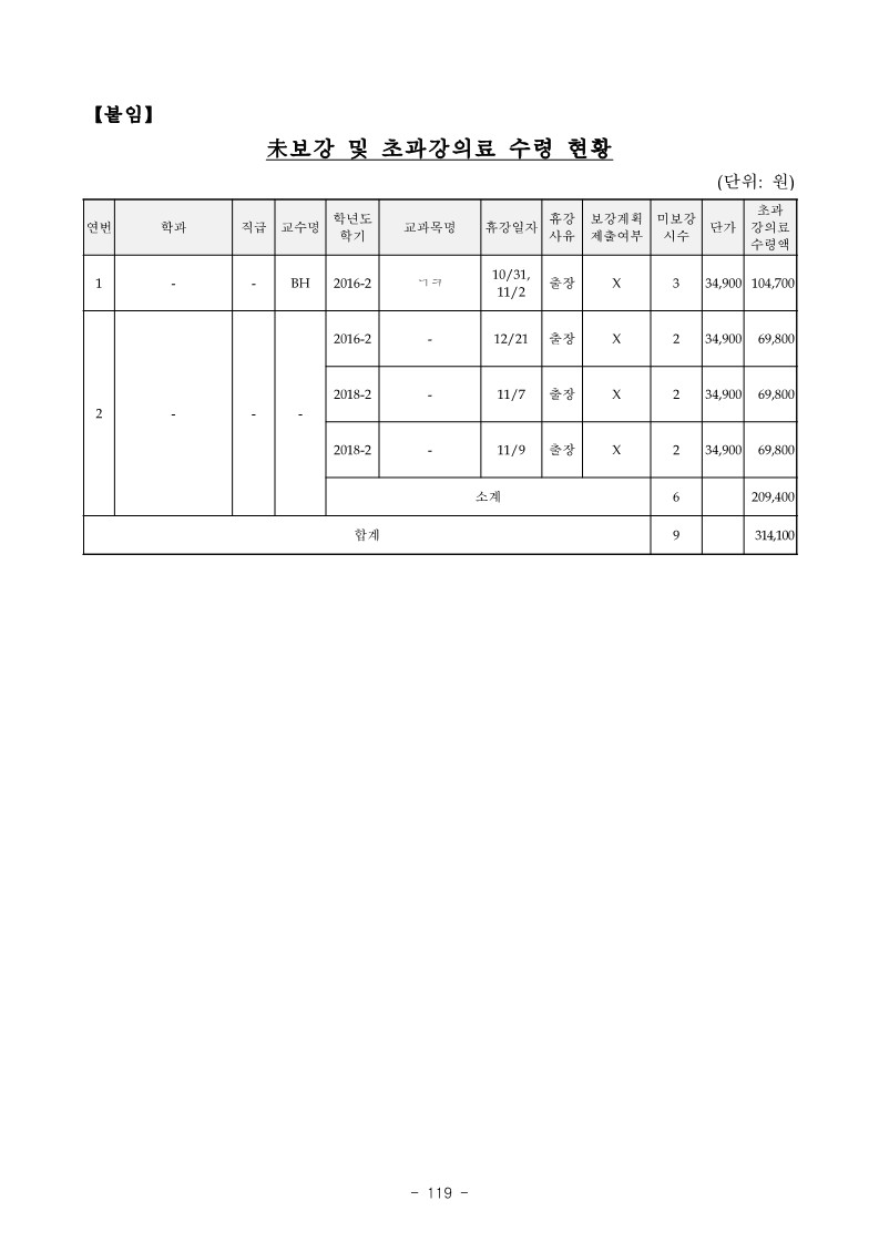 - 연세대학교 BH는 2016학년도 2학기에 ‘ㄱㅋ’ 교과목을 담당하면서 2016. 10. 31. 및 11. 2. 두차례에 걸쳐 휴강 계획서 없이 휴강하고도 보강계획서 제출 없이 보강도 하지 아니하고 초과강의료 104,700원을 지급받는 등 【붙임】“미보강 및 초과강의료 수령 현황”과 같이 2016학년도 2학기부터 2018학년도 2학기까지 위 BH 등 교수 2명은 위 ㄱㅋ 등 2개 교과목(9시간)을 담당 하면서 휴강계획서 없이 휴강하고도 보강계획서 제출 없이 보강도 하지 아니하고 초과강의료 합계 314,100원을 지급 받은 사실이 있음.