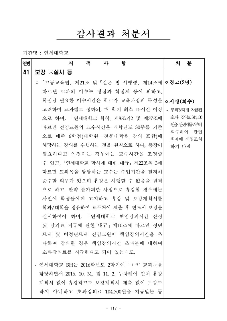 - 부적정하게지급된 초과 강의료314,100 원을관련자들로부터 회수하여 관련 회계에 세입조치 하기 바람