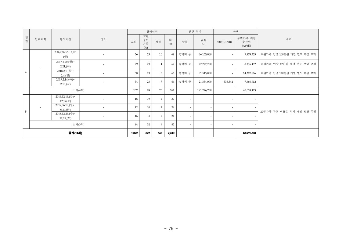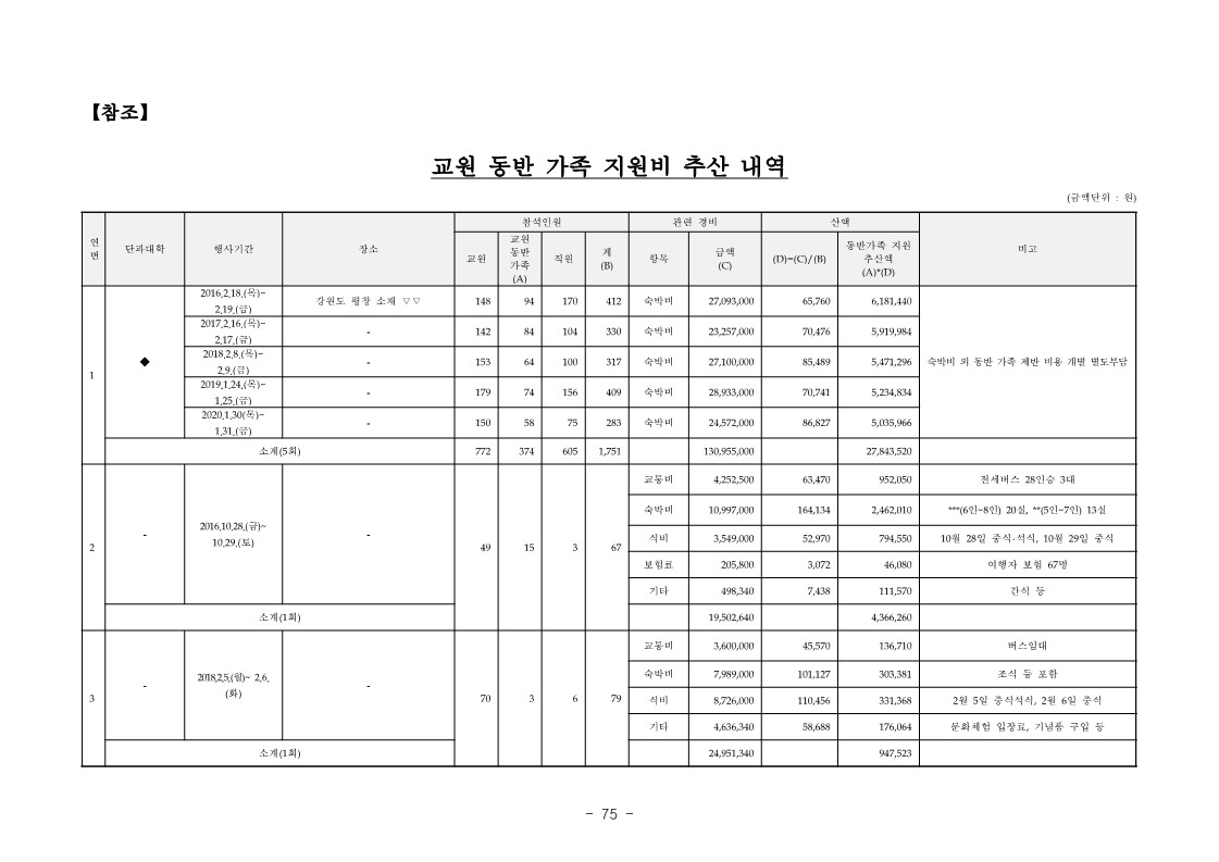 ※ 위 행사비 합계 624,425,124원 중 숙박비 별도 부담액 등을 고려 하면 교원 동반 가족에 대한 지원비는 합계 68,991,703원으로 추산