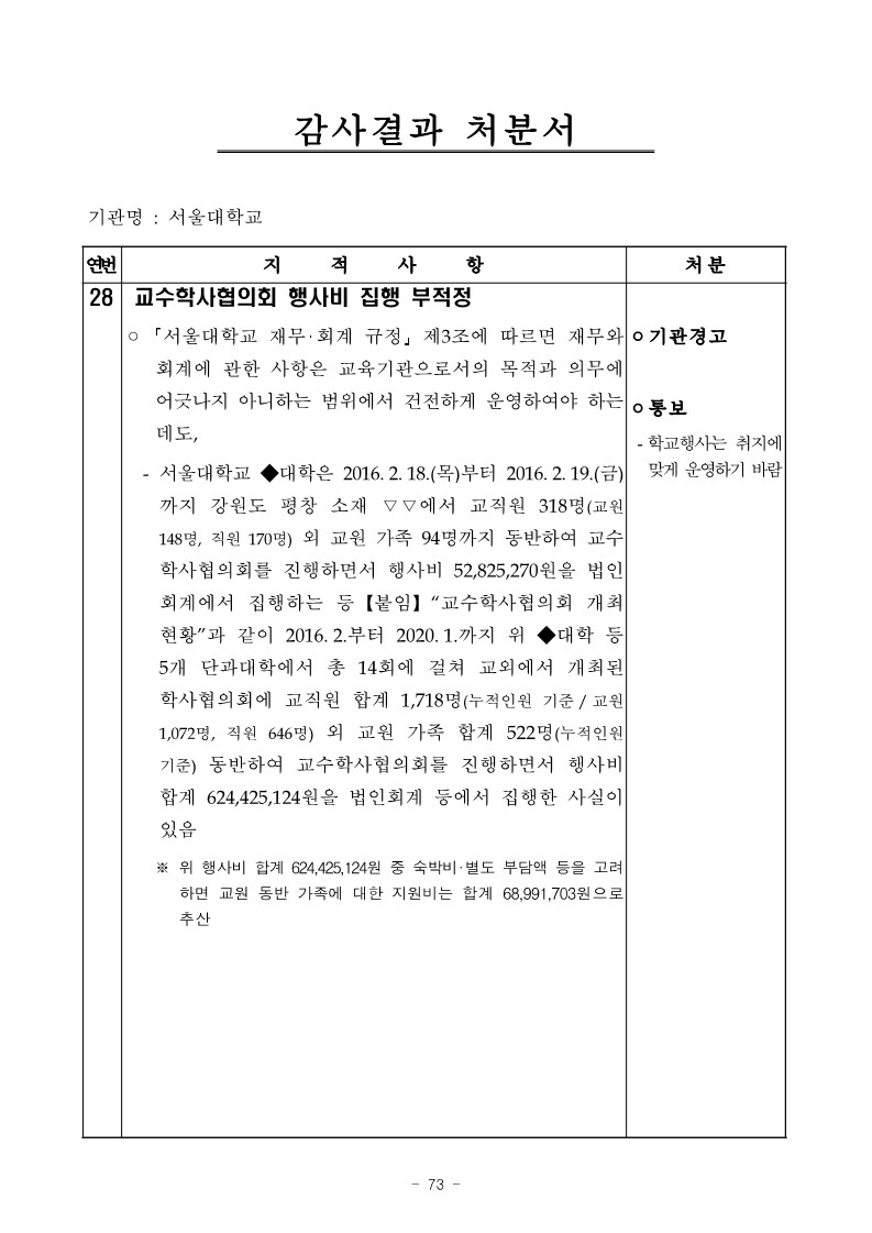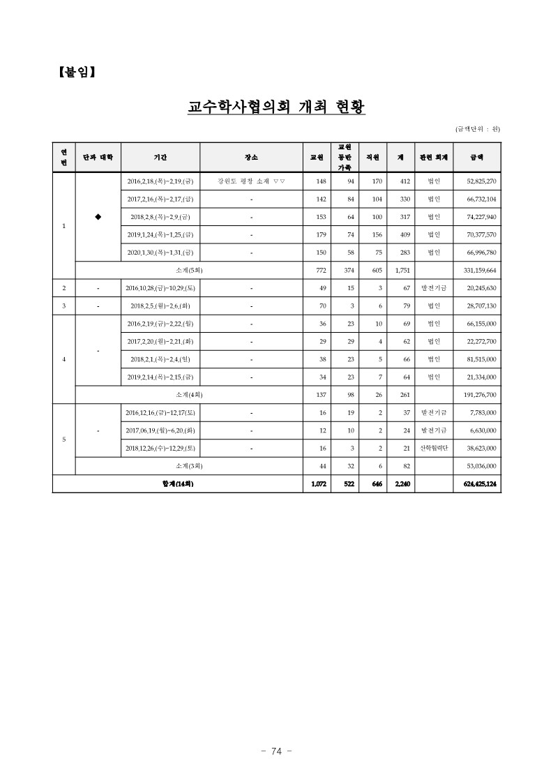 - 서울대학교 ◆대학은 2016. 2. 18.(목)부터 2016. 2. 19.(금) 까지 강원도 평창 소재 ▽▽에서 교직원 318명(교원 148명, 직원 170명) 외 교원 가족 94명까지 동반하여 교수 학사협의회를 진행하면서 행사비 52,825,270원을 법인 회계에서 집행하는 등【붙임】“교수학사협의회 개최 현황”과 같이 2016. 2.부터 2020. 1.까지 위 ◆대학 등 5개 단과대학에서 총 14회에 걸쳐 교외에서 개최된 학사협의회에 교직원 합계 1,718명(누적인원 기준/ 교원 1,072명, 직원 646명) 외 교원 가족 합계 522명(누적인원 기준) 동반하여 교수학사협의회를 진행하면서 행사비 합계 624,425,124원을 법인회계 등에서 집행한 사실이 있음