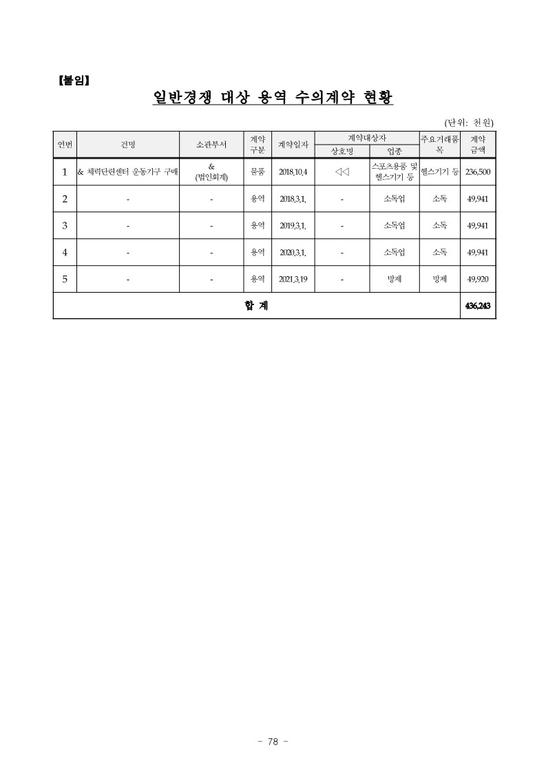 - 서울대학교는 2018. 10. 4. 일반경쟁 계약 대상인 ‘& 체력단련센터 운동기구’ 구매건을 ◁◁와 수의계약 (계약금액 : 236,500천원) 체결하는 등【붙임】“일반경쟁 대상 용역 수의계약 현황”과 같이 2018. 12.부터 2019. 12.까지 위 ‘& 체력단련센터 운동기구’ 구매 등 일반경쟁 입찰대상계약 총 5건, 합계 436,243천원을 수의계약 체결한 사실이 있음