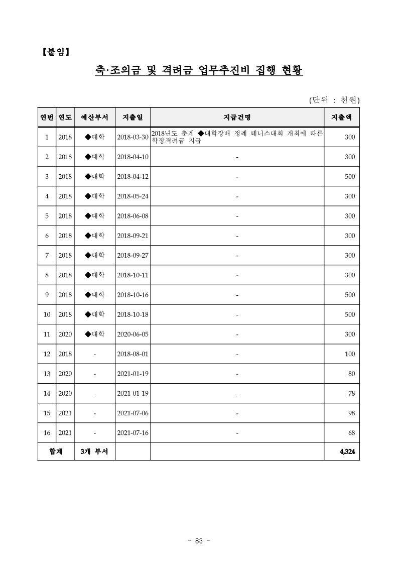 - 서울대학교 ◆대학은 2018. 3. 30. “2018년도 춘계 ◆ 대학장배 정례 테니스대회 개최에 따른 학장격려금” 300천원을 기타운영비가 아닌 업무추진비로 집행하는 등【붙임】“축·조의금 및 격려금 업무추진비 집행 현황”과 같이 2018.부터 2021. 10. 감사일 현재까지 위 ◆대학 등 3개 부서는 위 “2018년도 춘계 ◆대학 장배 정례 테니스대회 개최에 따른 학장격려금” 등 총 16차례에 걸쳐 축·조의금 및 격려금 합계 4,324천원을 기타운영비가 아닌 업무추진비로 집행한 사실이 있음
