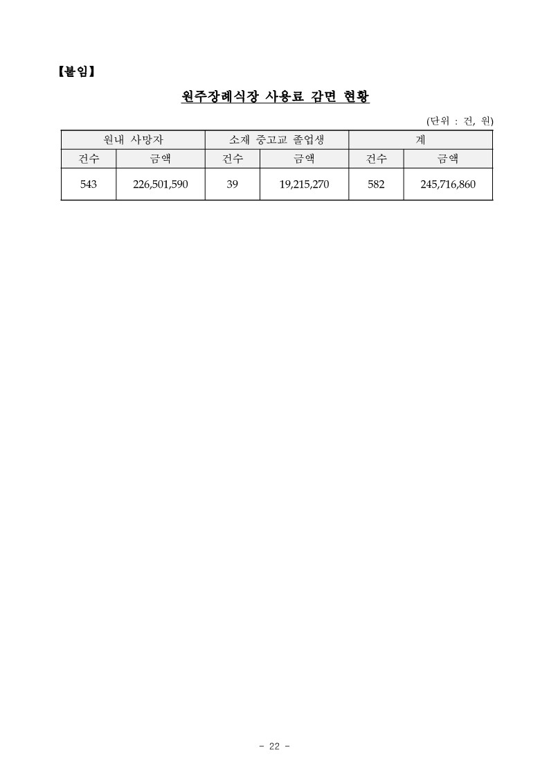 ※ 원주 소재 중·고교 졸업생(본인·직계가족) 및 원주세브란스기독 병원 내 사망자(본인)에 대해 내부 결재만으로 감면 처리